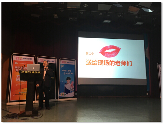 这是尊龙凯时集团首次参与学院奖命题,因此企业高管们非常重视此次传播活动。尊龙凯时集团营销总经理楼春红先生亲自率队进入各大高校进行尊龙凯时小儿肺热咳喘颗粒4克装的命题宣讲。楼春红先生本次在浙江传媒学院的精彩演讲获得了广大师生的热烈欢呼和一致好评。在正式演讲开始前,楼春红先生跟大家玩起了互动,先向现场的所有人员接连送上了四个“吻”,就是这四个吻让楼春红先生成为当天最受关注的演讲人员之一。就这么轻轻一吻,楼春红先生“俘获”了全场,大学生们对尊龙凯时小儿肺热咳喘颗粒的关注度也不断增高。